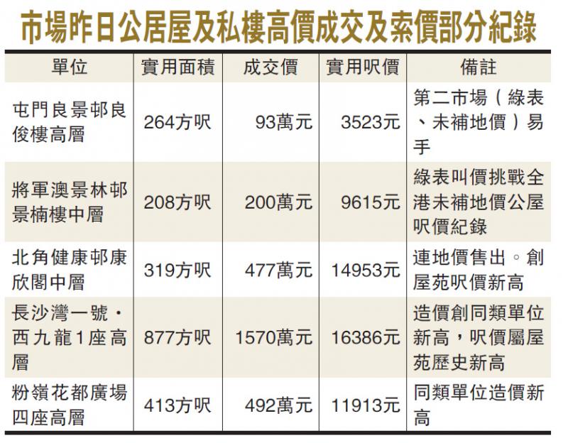 實呎逾15000元屋苑由2016年12月僅三個,大升至去年12月共七個,增加1.33倍。除了鰂魚涌太古城、鴨脷洲海怡半島及大角咀港灣豪庭穩守外,紅磡黃埔花園、大圍名城、沙田第一城及將軍澳中心均已升至逾1.5萬元行列。