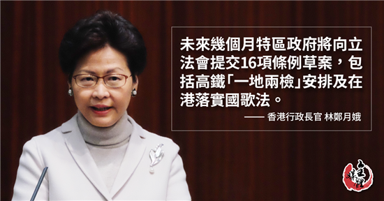 林鄭表示,連同稅務條例,未來幾個月特區政府將向立法會提交16條條例草案,包括高鐵「一地兩檢」安排及在港落實國歌法。本立法年度餘下的時間,政府還將向財務委員會、人事編制委員會分別提交不少於30項建議,亦會向工務小組委員會提交80多項撥款申請,涉及工務工程總額約1300億元港幣,可開設職位44000個。