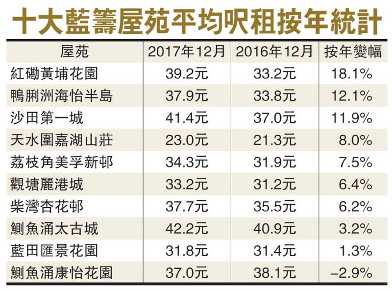 十大屋苑方面,紅磡黃埔花園租金錄得最大按年升幅,最新錄39.2元,較2016年的33.2元上升18.1%。其次為鴨脷洲海怡半島,按年升12.1%至每呎37.9元。第三為沙田第一城,按年升11.9%至每呎41.4元,平均呎租冠絕十大。
