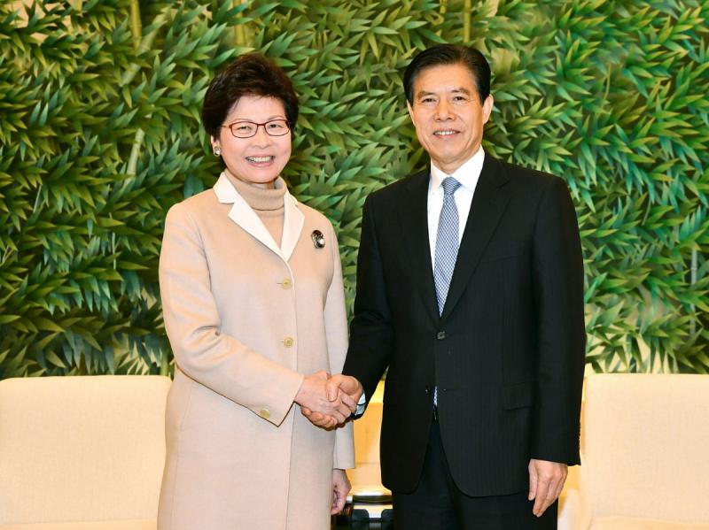 行政長官林鄭月娥(左)在北京與國務院港澳辦主任張曉明會面。