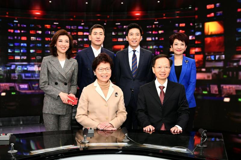 行政長官林鄭月娥在北京到訪央視總部大樓,與副台長魏地春(前排右)和節目主持人合照。