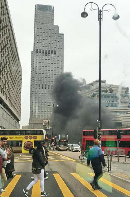 圖:尖沙咀梳士巴利道新世界中心地盤,昨發生火警,焚燒發泡膠物冒出大量黑煙,駛經地盤外巴士未受影響,衝過黑煙行駛\網上圖片