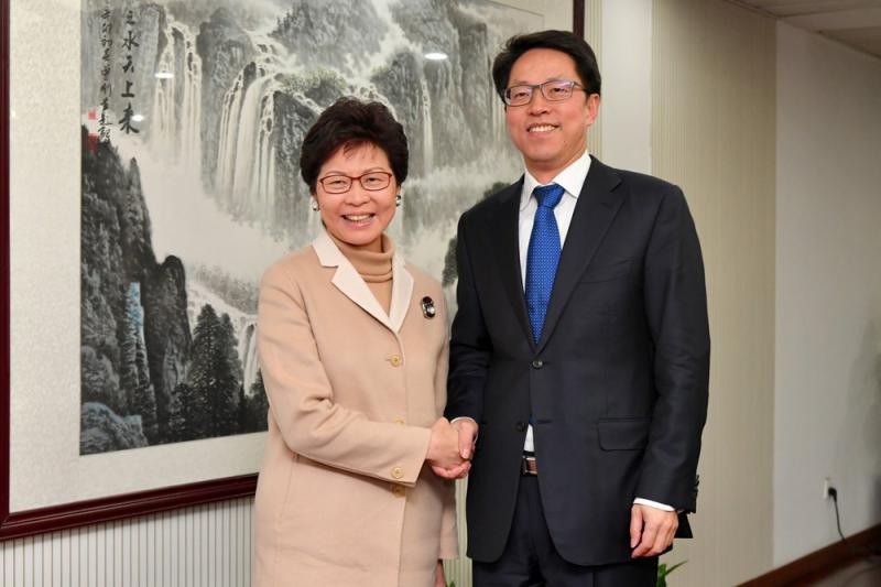 林鄭月娥昨日早上在商務及經濟發展局局長邱騰華、財經事務及庫務局局長劉怡翔、政制及內地事務局局長聶德權和特首辦主任陳國基陪同下,拜會商務部部長鍾山。