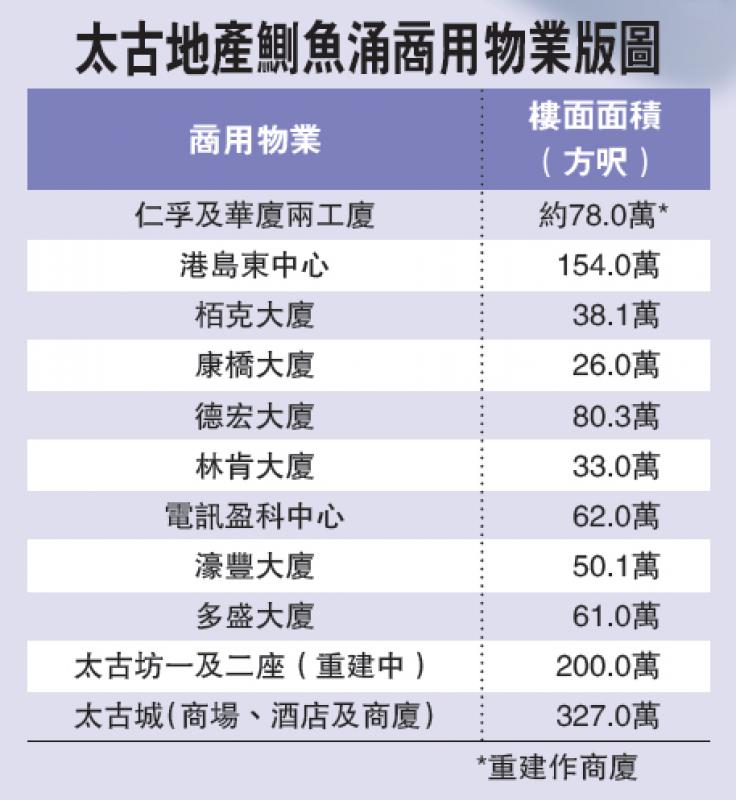 上述商用物業,總樓面超過1030萬方呎。而兩工廈未來作商用重建後,會為太古在鰂魚涌再添約77.9萬方呎。
