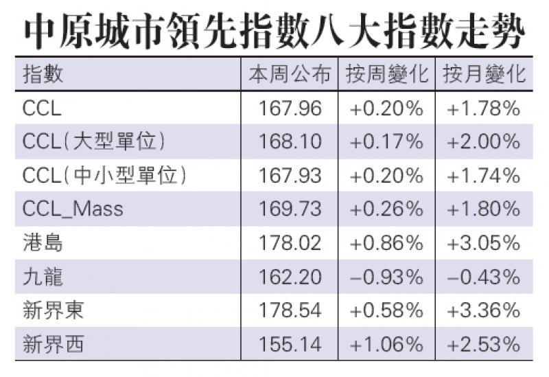 樓價高高高,兩大樓價指數接力創新高!繼差估署後,另一項反映樓價走勢的中原城市指數(CCL),最新報迫近168點又創紀錄,四大整體指數連續三周齊創新高,其中備受豪宅連環破頂刺激,大型單位指數表現最標青跑贏大市,報168.1點連續五周新高,平去年六月紀錄。