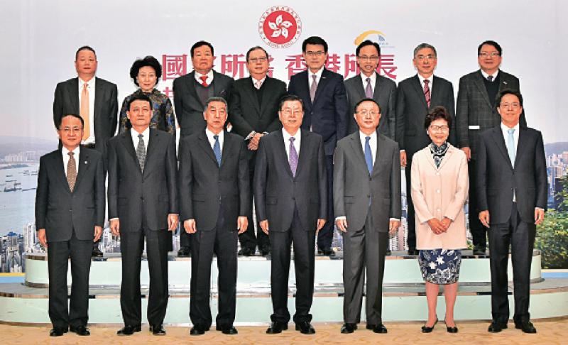 圖:「國家所需 香港所長─共拓『一帶一路』策略機遇」論壇昨在北京舉行。前排左起:中聯辦主任王志民;國務院國有資產監督管理委員會主任肖亞慶;國務委員王勇;全國人大常委會委員長張德江;國務委員楊潔篪;林鄭月娥;港澳辦主任張曉明;後排左起:「一帶一路」總商會創始人潘蘇通、鄭翔玲和嚴彬;「一帶一路」總商會理事會主席林建岳;商經局局長邱騰華;政制及內地事務局局長聶德權;財經事務及庫務局局長劉怡翔和行政長官辦公室主任陳國基出席論壇前合照