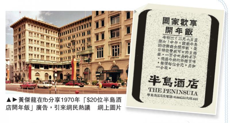 圖:黃傑龍在fb分享1970年「$20位半島酒店開年飯」廣告,引來網民熱議/網上圖片