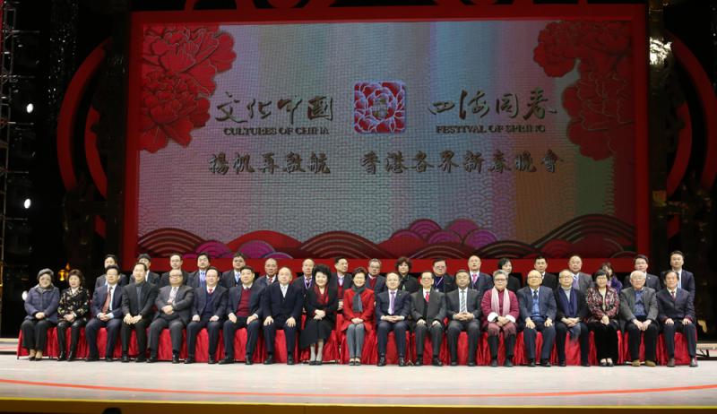 圖:二○一八香港各界新春晚會首天公演,特區行政長官林鄭月娥,國務院僑務辦公室主任裘援平,中聯辦主任王志民、副主任譚鐵牛,駐港部隊司令員譚本宏,外交部駐港公署副特派員楊義瑞等出席