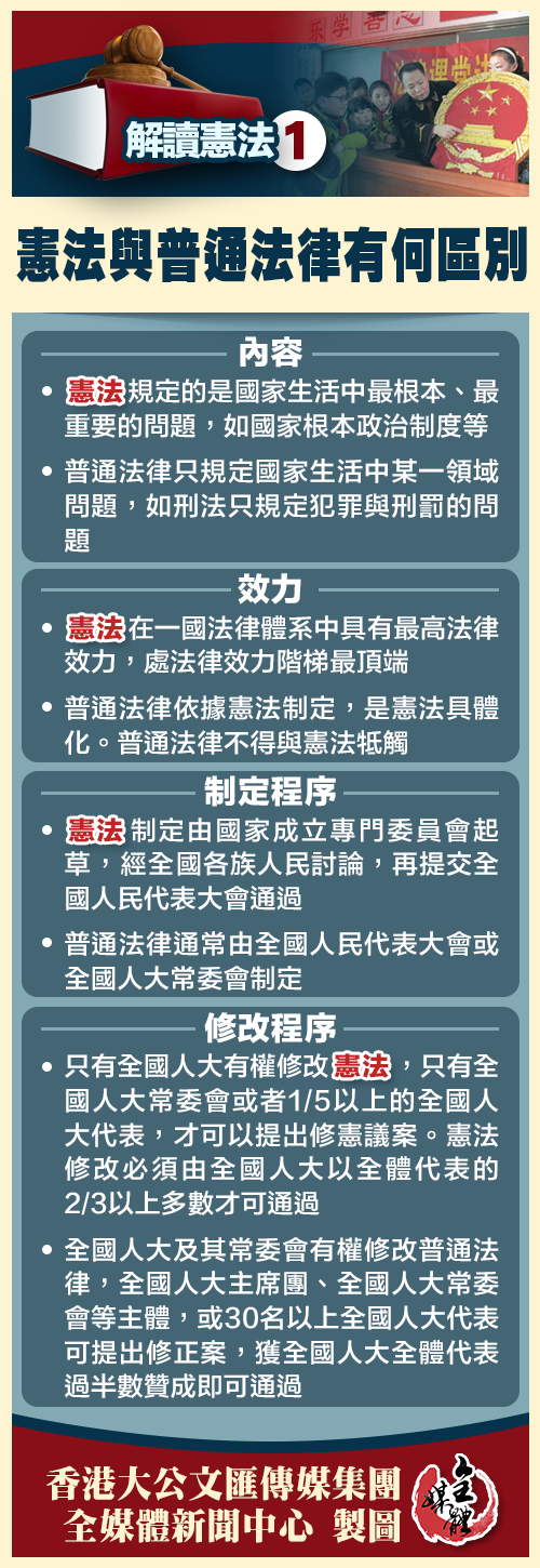 大公文匯全媒體報道:在現代國家法律體系中, 憲法處於法律位階的最頂端,擁有最高法律效力。專家表示,作為根本大法,憲法在一個主權國家法律體系中居於核心地位,具有最高法律效力。在當下中國,實施逾30年的憲法的地位得到了充分保障。那麼憲法的核心地位如何體現,與普通法律又有什麼區別,這個懶人包告訴你。
