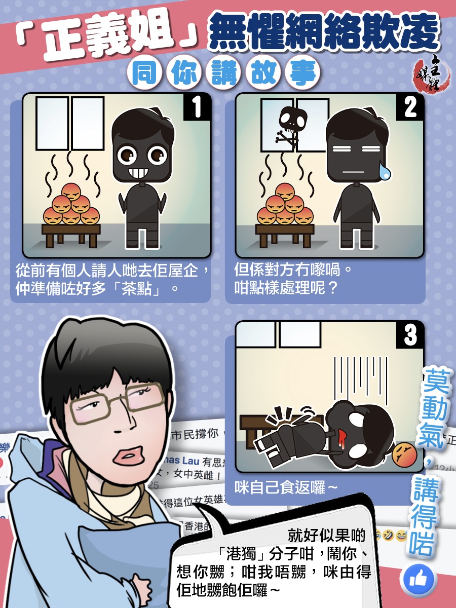 大公文匯全媒體報道:以精簡犀利的發言KO「香港眾志」周庭,贏得眾多市民讚賞而有「正義姐」之稱的藍雪寶,亦因此成為「港獨」分子的眼中釘。近日藍雪寶更受到「港獨」分子在網上對其進行言語暴力,「起底」她任職學校,進行恐嚇。不過,「正義姐」無畏無懼,強調不會回覆「港獨」分子,還講起故事做比喻,「佢哋鬧你係想你嬲,你唔嬲,就等佢哋自己嬲飽佢」。網民大讚她高智慧、高情商,批評「港獨」分子不容異見,實屬惡霸、假民主。
