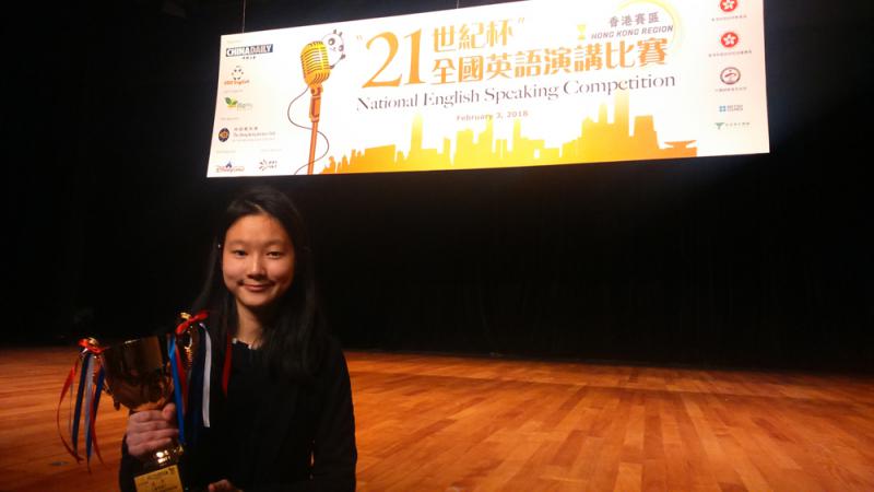圖:馬曉真參加「21世紀杯」全國英語演講比賽|香港賽區(中學組)頒獎禮\大公報記者楊綺青攝