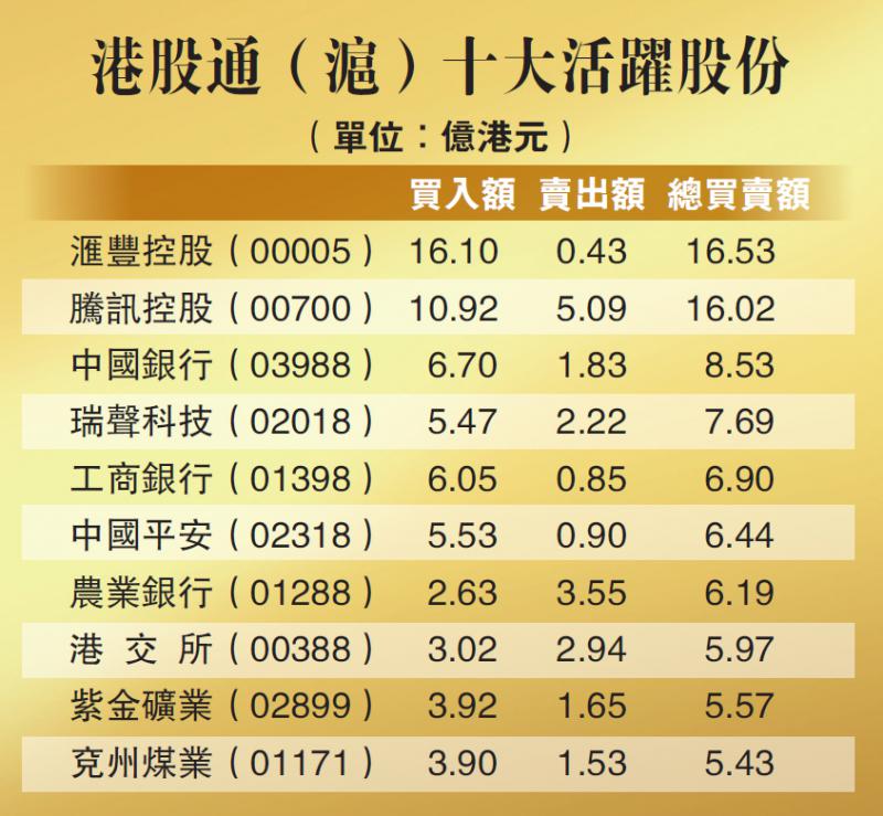 港股通昨日入市買盤達到195億元,較上日增加57%,淨流入總額102億元人民幣,增加89%,是2015年4月份「港股大時代」以來最旺場。在港股通(滬)機制下,滙控(00005)獲最多北水捧場,買入額達16.1億元,其次是騰訊(00700)買入額10.9億元。