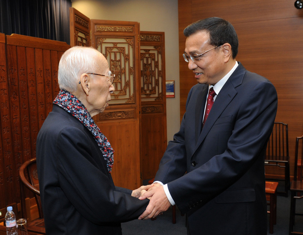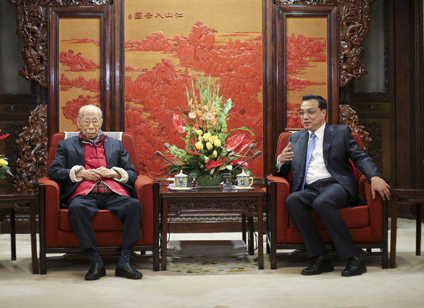2015年4月27日,國務院總理李克強在北京中南海紫光閣會見饒宗頤先生(新華社)