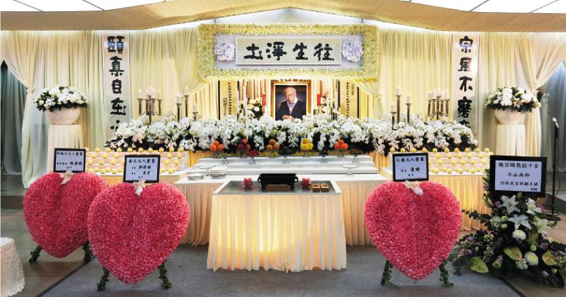 在大師的遺照前,放有三個家人贈送的粉紅色心形花牌,以及行政長官林鄭月娥贈送的寫有「斗山共仰」的花牌。國家領導人致送的花圈,內地與香港社會各界團體、人士,海內外友人等致送的花圈擺滿靈堂內外。