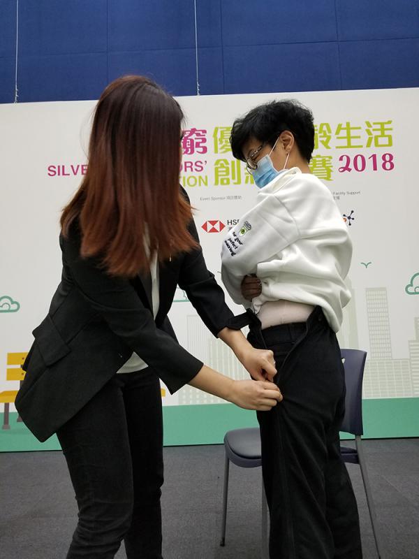 初創項目「桑榆行動」負責人劉先穎表示,「穿脫易」是將套頭式衣服改成開胸式,長者關節痛,不能用力,手臂不易抬高或伸展,穿套頭衣服務時會感到不適,甚至拉傷肌肉,照顧者也不方便為其更換。輪椅褲則是改裝運動褲及西褲,經修改的褲兩側有拉鏈,方便坐椅時亦能更換,拉鏈處有扣子,確保穿得更穩固。
