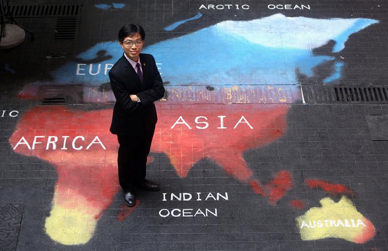 「還有一個秘密,這個地圖是有色溫的,我們是按地球氣候冷熱溫度數據而設計。」許振隆校長站到了天井裏的地圖上,應站在一樓走廊攝影師的要求擺出不同甫士,背後不遠處就是北冰洋,右邊是大西洋,環球冷暖一目了然,特別直觀。他透露,這幅有溫度的地圖是眾人合作的結晶,標中視藝科、地理科等科師生都參與了,整理數據、髹油、上色,分工合作,樂也融融。