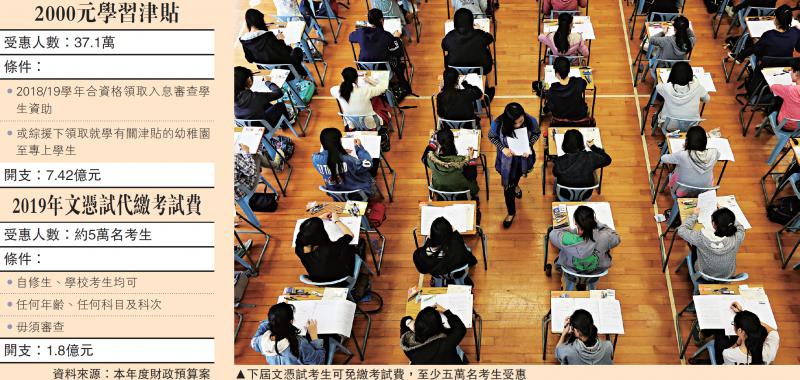 新一份《財政預算案》亦向學生及家長「派糖」,提出在2018/19學年,向37.1萬名有經濟需要的學生各派發2000元,預計開支約7.4億元。不過,中產家長未能受惠上述措施,認為應向全港學生派發2000元。同時,政府將首次為中學文憑試全體考生代繳考試費,約五萬名來屆考生受惠,涉及開支1.8億元。