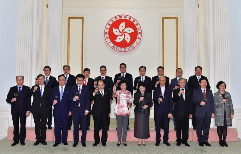 圖:林鄭月娥與政府高級官員在禮賓府新春酒會上向嘉賓祝酒