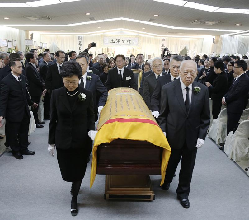 圖:全國政協副主席董建華、行政長官林鄭月娥、中聯辦副主任黃蘭發、中國文聯書記處書記陳建文、香港大學署理校長譚廣亨、中大校長段崇智、法蘭西銘文與美文學院通信院士汪德邁、港大饒宗頤學術館館長李焯芬,一共八人為饒公扶靈