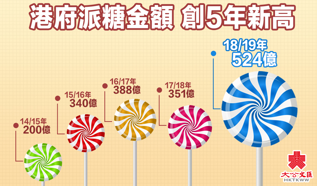 大公文匯全媒體報道:新一屆特區政府昨日(2月28日)公布首份財政預算案,政府破紀錄1380億元(港元,下同)巨額盈餘,財政司司長陳茂波向全港市民派出厚厚「利是」,一次性「派糖」逾524億元,較去年「派糖」的351億元,大增近200億元,創下近5年新高。