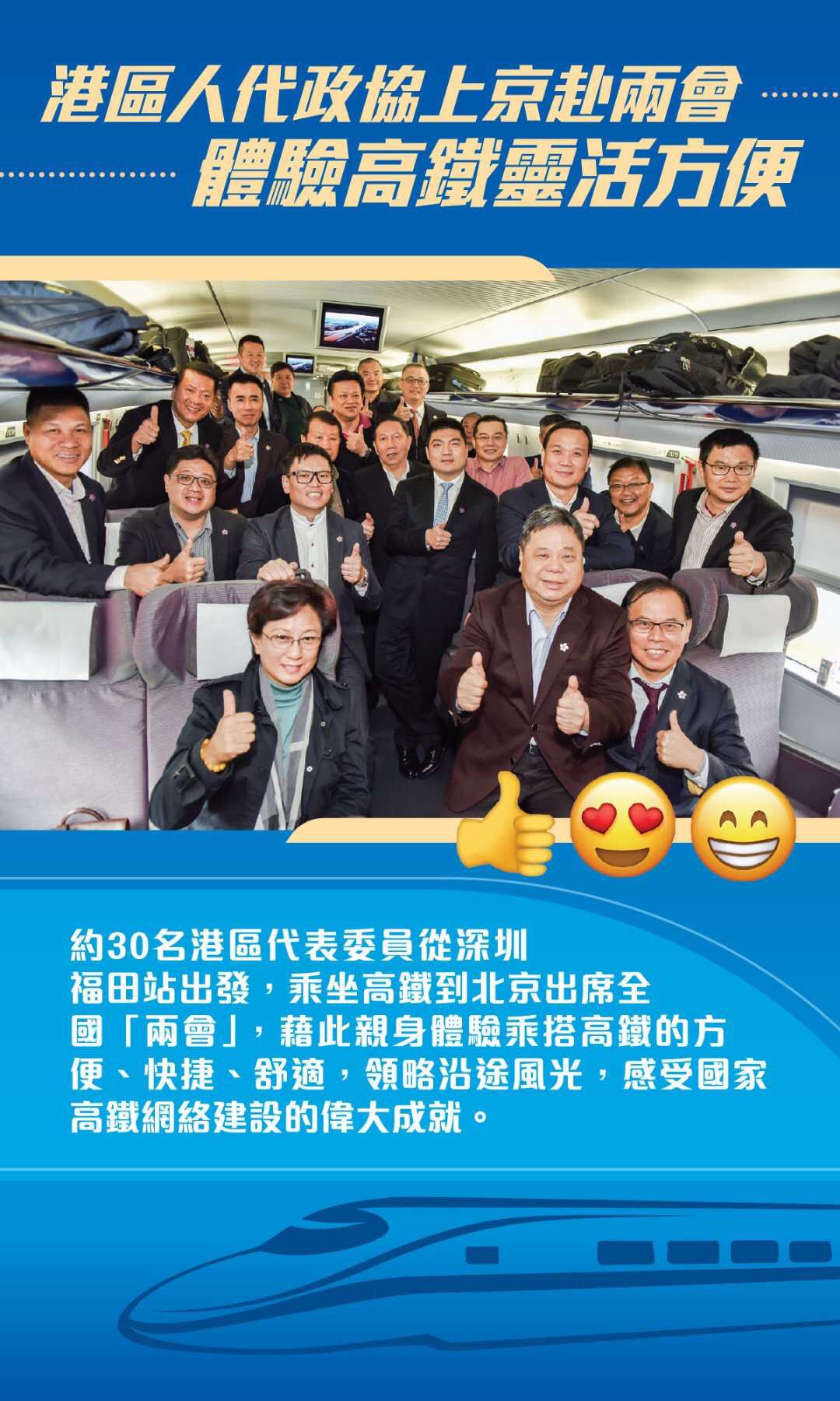 這是首次有港區全國人大代表和政協委員集體乘坐高鐵赴京參加「兩會」。代表委員們上午7時由深圳福田站出發,沿途經過廣州、長沙、武漢、鄭州、石家莊等十多個城市,歷時約11小時,於傍晚6時半左右抵達北京西站。高鐵的舒適快捷獲得代表委員們一致好評。