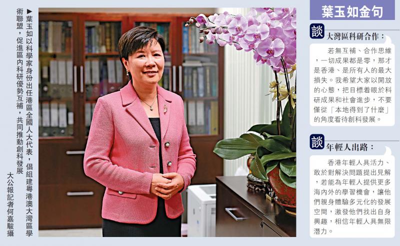 自然科學家通常給人不問世間事、埋首實驗室的印象,但在新一屆港區全國人大代表中,專攻腦退化症研究的香港科技大學副校長(研發及研究生教育)葉玉如算得上另類。她近日接受《大公報》專訪時,建議組建粵港澳大灣區學術聯盟,以促進區內各地實現科研優勢互補、推動創科發展,並希望在政策上,促成內地與香港科學家聯合申請大型科研項目。她強調,除了繼續投身科研工作,相信新崗位亦有助科學進步,又寄語社會勿僅從「本地得到了什麼」的角度看待創科發展,否則將難以做出成果。/大公報記者 莊恭誠