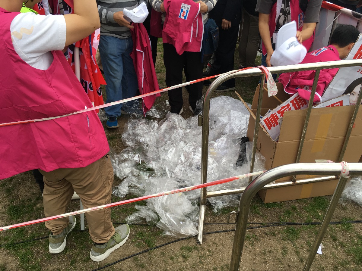 造勢大會結束後,義工清理現場,部分宣傳品收集後循環再用、做到環保。