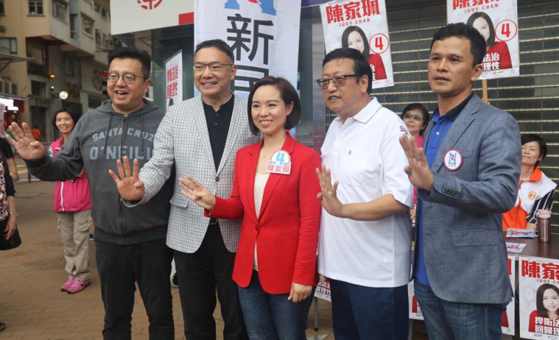 圖:陳家珮在跑馬地舉行造勢大會,表示市民想選出做實事的議員。黃宏泰、謝偉俊及吳錦津到場支持/大公報記者 林少權攝