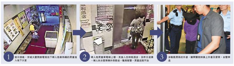 案發現場為駱克道175至191號京城大廈4樓一間時鐘酒店。從閉路電視片段可見,前日下午5時16分,外婆孭着背囊,手抱穿黃色外套、疑似熟睡的軒仔進入該大廈,她並在大廈外駐足數秒。