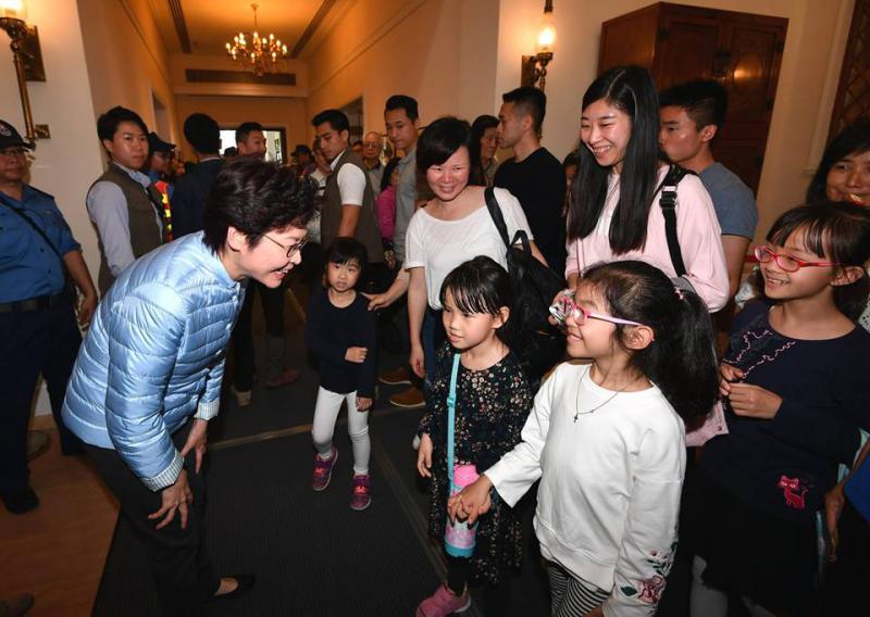 圖:禮賓府開放日,特首林鄭月娥與一班小遊客談心/Facebook圖片
