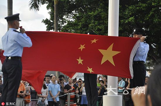 資料圖:在香港紫荊花廣場,遊客和市民在觀看國旗降旗儀式。/來源:東方ic
