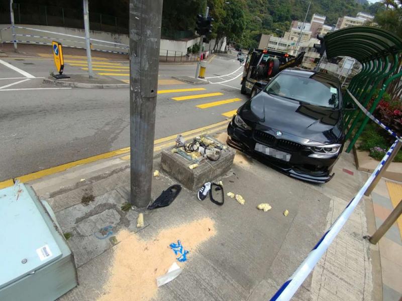 圖:涉事寶馬私家車剷上行人路,撞毀電箱。現場留有一對球鞋