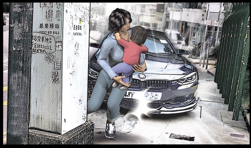手抱兩歲女兒的好媽媽被寶馬撞倒,左腳被夾在車頭與交通燈箱之間當場軋斷,右腳掌血肉模糊,緊抱於懷內的女兒幸無受傷。好媽媽倒地痛極,仍追問:我個女點呀?/大公報製圖