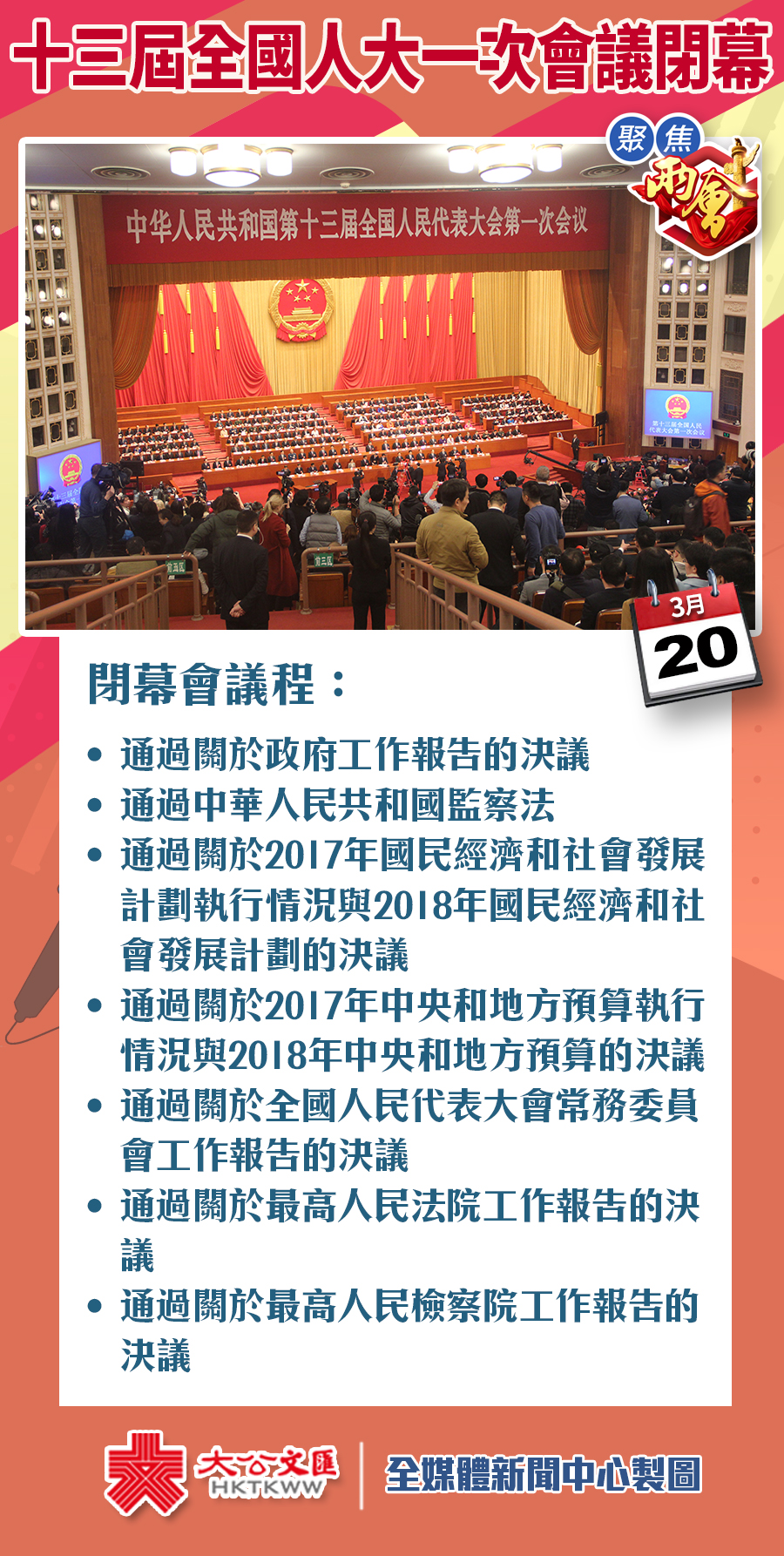 大公文匯全媒體報道:十三屆全國人大一次會議今日(20日)上午舉行閉幕會,大會通過了各項決議和《中華人民共和國監察法》。國家主席習近平和十三屆全國人大常委會委員長栗戰書發表了講話。