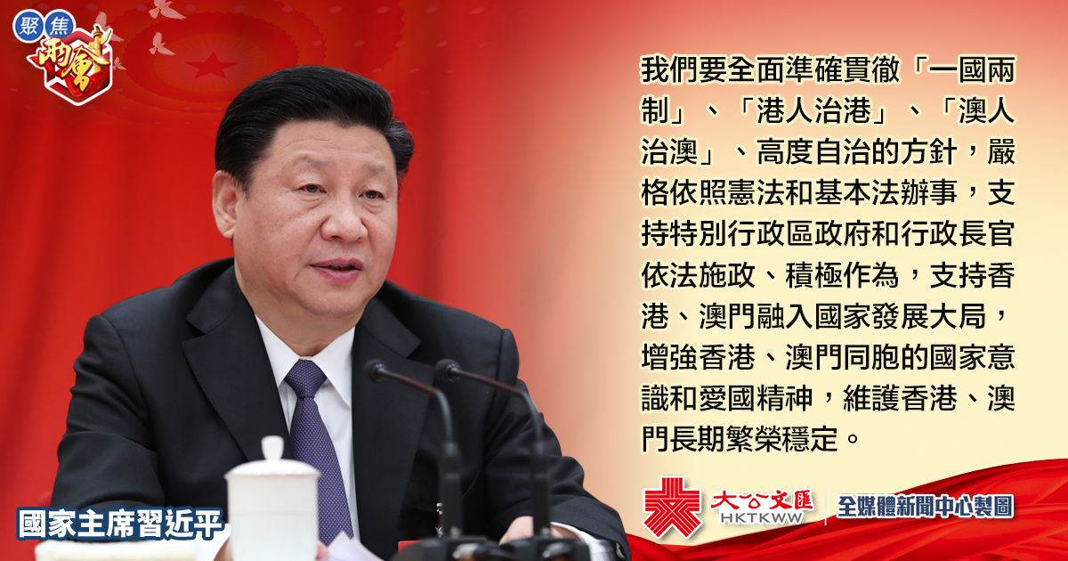 大公文匯全媒體報道:20日上午,十三屆全國人大一次會議於北京人民大會堂舉行閉幕會,國家主席習近平發表重要講話。習近平表示,要全面準確貫徹「一國兩制」、「港人治港」、「澳人治澳」、高度自治的方針,嚴格依照憲法和基本法辦事,支持特別行政區政府和行政長官依法施政、積極作為,支持香港、澳門融入國家發展大局,維護香港、澳門長期繁榮穩定。