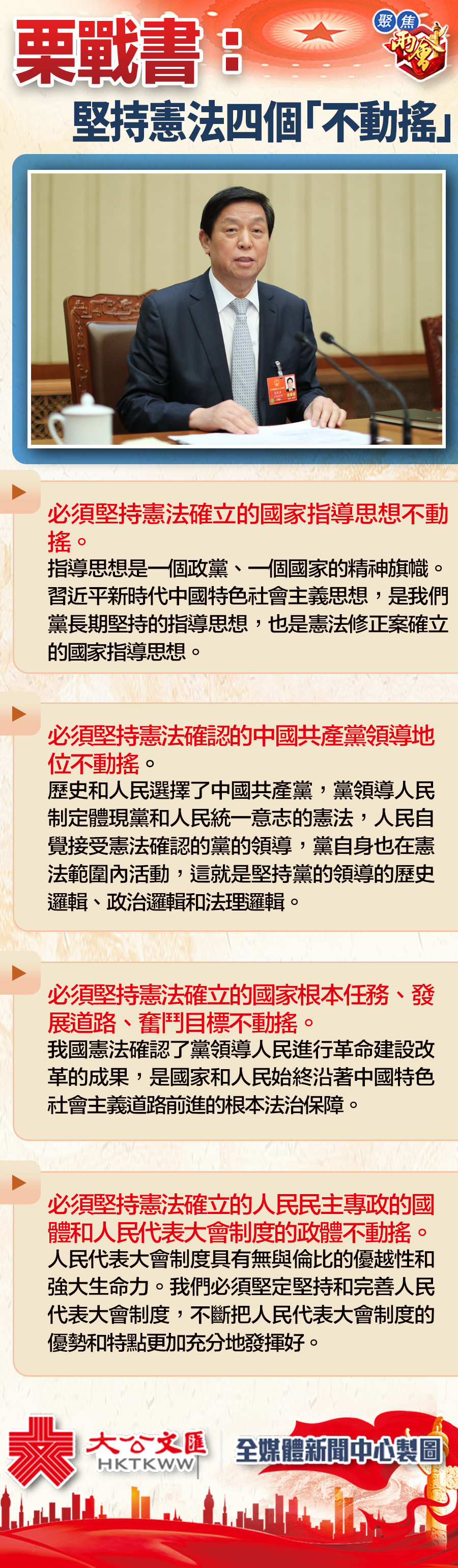 大公文匯全媒體報道:20日上午,十三屆全國人大一次會議於北京人民大會堂舉行閉幕會,全國人大常委會委員長栗戰書在閉幕會上發表講話。栗戰書說,憲法是國家的根本法,具有最高的法律地位、法律權威、法律效力,必須堅持憲法確立的國家指導思想不動搖;必須堅持憲法確認的中國共產黨領導地位不動搖;必須堅持憲法確立的國家根本任務、發展道路、奮鬥目標不動搖;必須堅持憲法確立的人民民主專政的國體和人民代表大會制度的政體不動搖。