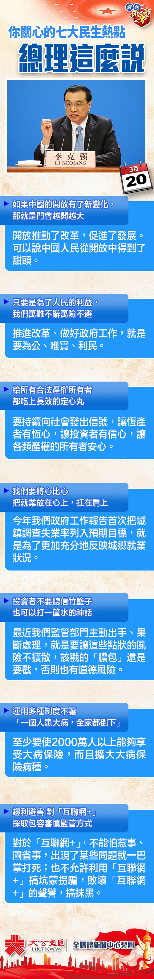 大公文匯全媒體報道:3月20日上午,國務院總理李克強在人民大會堂三樓金色大廳,會見中外記者並回答15條提問,內容包括民眾關心的就業、醫療保險、「互聯網+」等。一圖看李克強總理答問要點。
