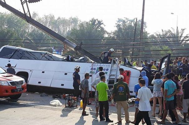 一輛載有中國遊客的大巴2月16日從泰國甲米駛往攀牙的途中發生車禍,17名中國遊客受傷(新華社)