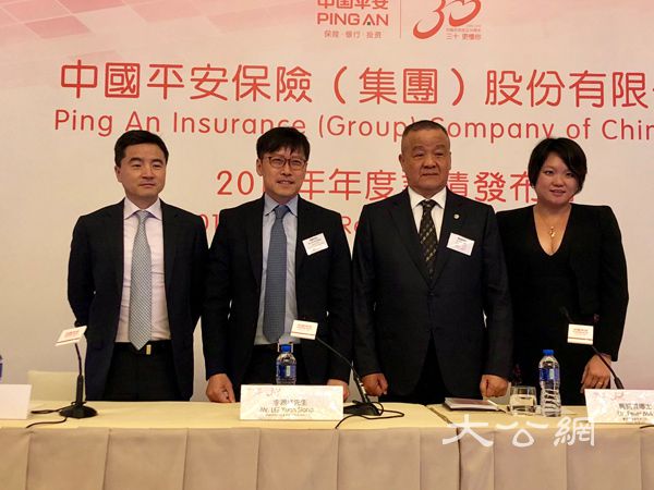 左起:中國平安首席財務官兼總精算師姚波、副首席執行官兼首席保險業務執行官李源祥、董事長兼首席執行官馬明哲及副首席執行官、首席運營官兼首席資訊執行官陳心穎。(大公報記者邵淑芬攝)