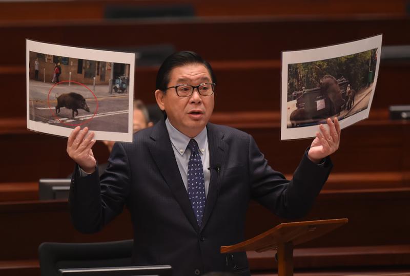 早前猴子爬入屋邨「搵食」,惹起公眾熱話,同樣不可忽視的是野豬問題。經民聯副主席林健鋒(Jeffrey)昨日在立法會大會提出口頭質詢,指出野豬覓食已從近郊地區蔓延至市區,威脅市民安全。他又稱,曾親眼在半山、薄扶林看到野豬出沒,「(環境局黃錦星)局長經常行山,相信你會看到野豬咁大隻,有些真的比你大,比你重,有些還懂得游泳。」他又擔心,如果黃錦星行山時被野豬撞倒怎樣辦,希望政府盡快處理。