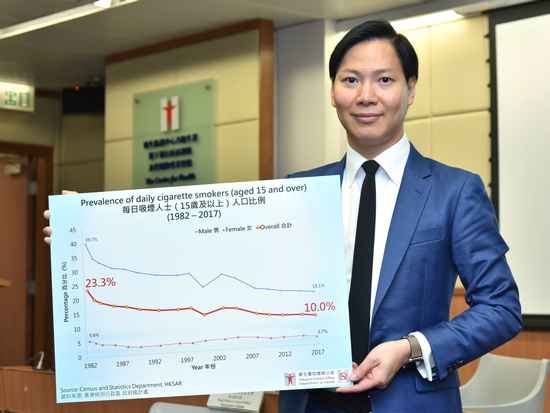 大公文匯全媒體綜合報道:香港衞生署今日(22日)公布政府最新調查結果,香港吸煙人士比率持續呈下降趨勢,2017年習慣每日吸煙的15歲及以上人士的比率為10.0%;年齡介乎15至19歲的青少年吸煙比率下降至1.0%。