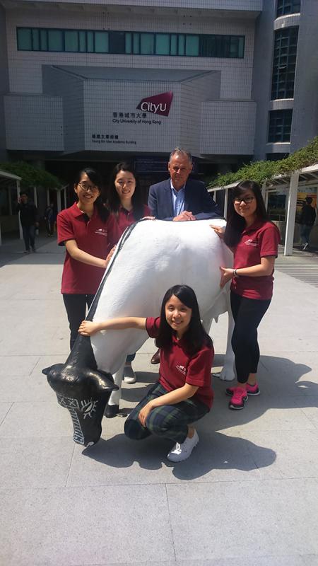 圖:劉穎嫻(左一)、鄭樂施(左二)、獸醫學院院長Michael Reichel、謝明懿(左四)及林雋希(前),在城大校園內與一比一的牛塑像合照