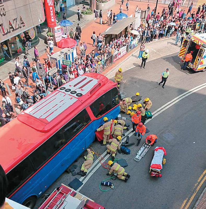 葵涌發生致命交通意外。一名82歲老婦,昨午在葵涌廣場外橫過馬路時,被一部收掣不及旅遊巴撞倒,復捲入車底重傷被困,消防員接報到場,將陷於昏迷老婦救出,惜送院搶後證實不治。警方拘捕肇事旅遊巴司機,正調查意外肇因。
