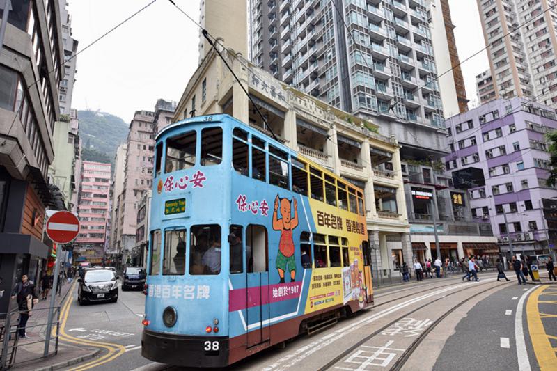 圖:香港的街道上行駛着有114年歷史的電車,與雙層巴士、豪華轎車各行其道
