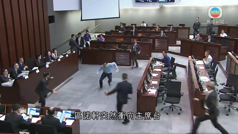 圖:區諾軒(白衣者)昨公然暴力衝擊立法會會議,三名保安合力制止,其中一名保安為攔截區繼續向前衝而被撞跌倒地。而有關會議因此兩度暫停 電視截圖