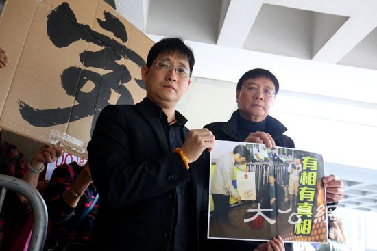 提出司法覆核的港島區選民黃大海早上在工聯會區議員王國興的陪同下抵達高等法院,兩人在法院外以手拍鼓,並手持寫有「冤」字的紙牌,以寓「擊鼓鳴冤」。答辯人區諾軒則沒有到庭。(大公報記者麥潤田攝)