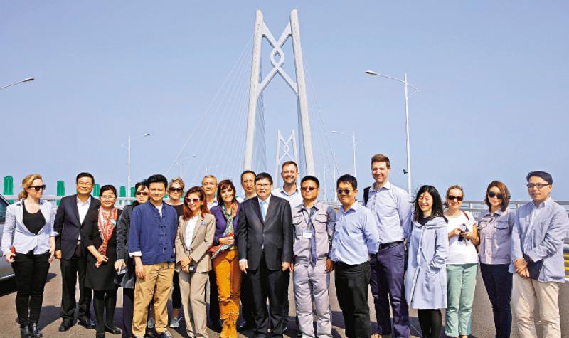 圖:港珠澳大橋通車在即,外交部駐港公署昨日邀請駐港外國記者一行30人參觀大橋,了解大橋工程的最新進展。前排左四為宋如安副特派員