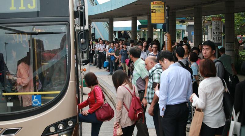圖:等候巴士的市民自覺排成「一字長蛇陣」,秩序井然