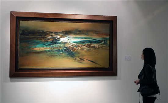觀眾在香港蘇富比2018年春拍預展上觀看焦點拍品趙無極的《24.04.62》,作品估價為6000-8000萬港元 (新華社)