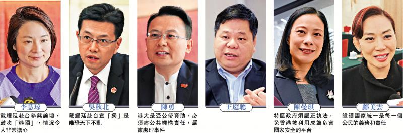 香港大學法律系副教授、非法「佔中」搞手戴耀廷,日前在台灣大放厥詞、鼓吹「港獨」的謬論,引起全城怒吼痛斥。多個政團在昨日假期發表聲明,對其言論大感憤怒,予以嚴厲譴責,強調「港獨」踐踏國家主權和「一國兩制」、不符憲法和基本法,只會為香港帶來破壞與內耗,要求港大開除其教席,以免影響青年教育,並呼籲社會要對所有危害國家安全和領土完整的組織及行為加以警惕。有政界人士認為,特區政府不應再放慢關乎國家安全的基本法23條立法步伐。/大公報記者 莊恭誠